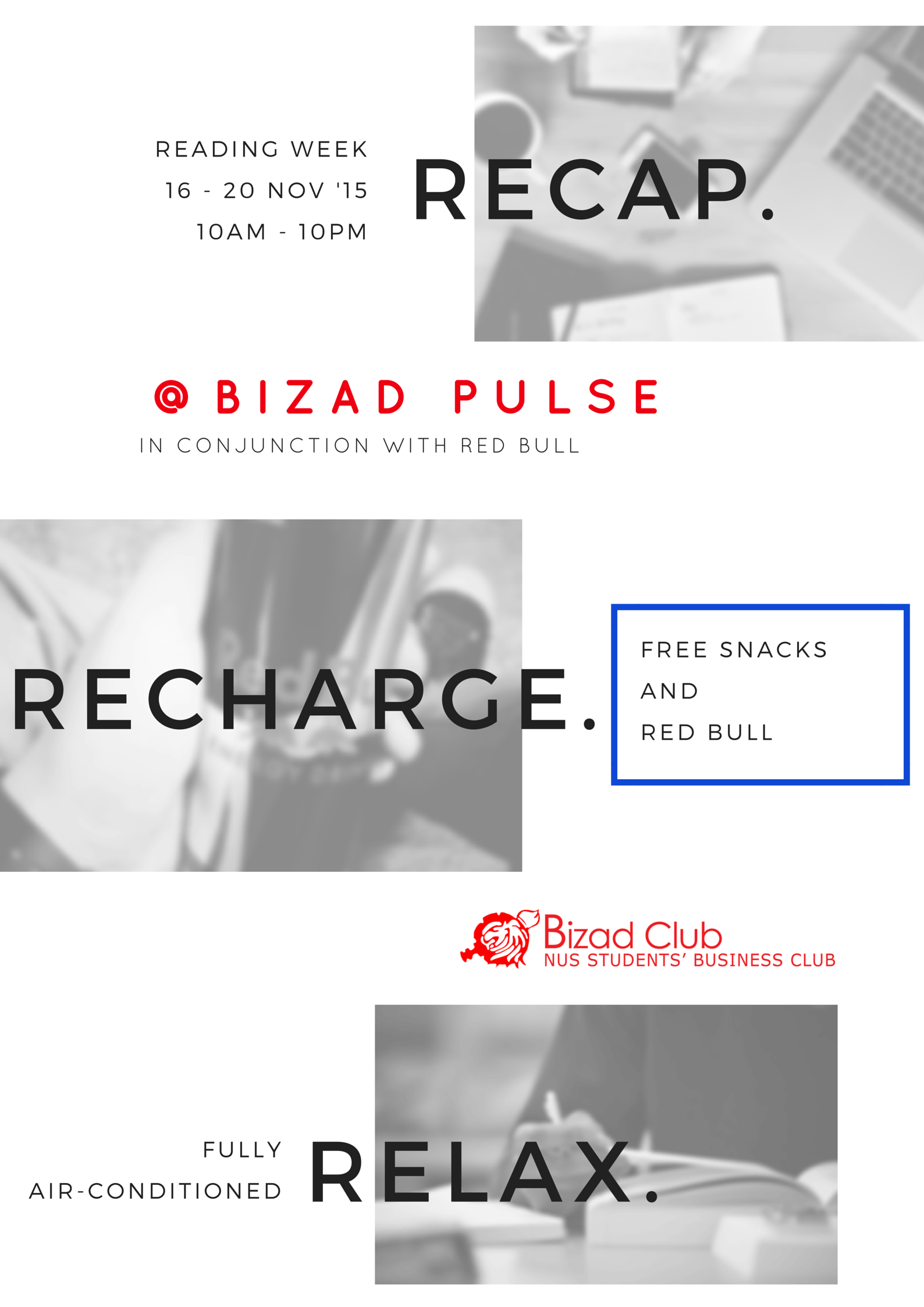 Hello fellow Bizaders! The first semester is about to end and Finals are just around the corner! We know many of you are studying hard night and day to prepare. In lieu of this, Bizad Club is transforming the Pulse into a convenient and conducive study lounge for you!